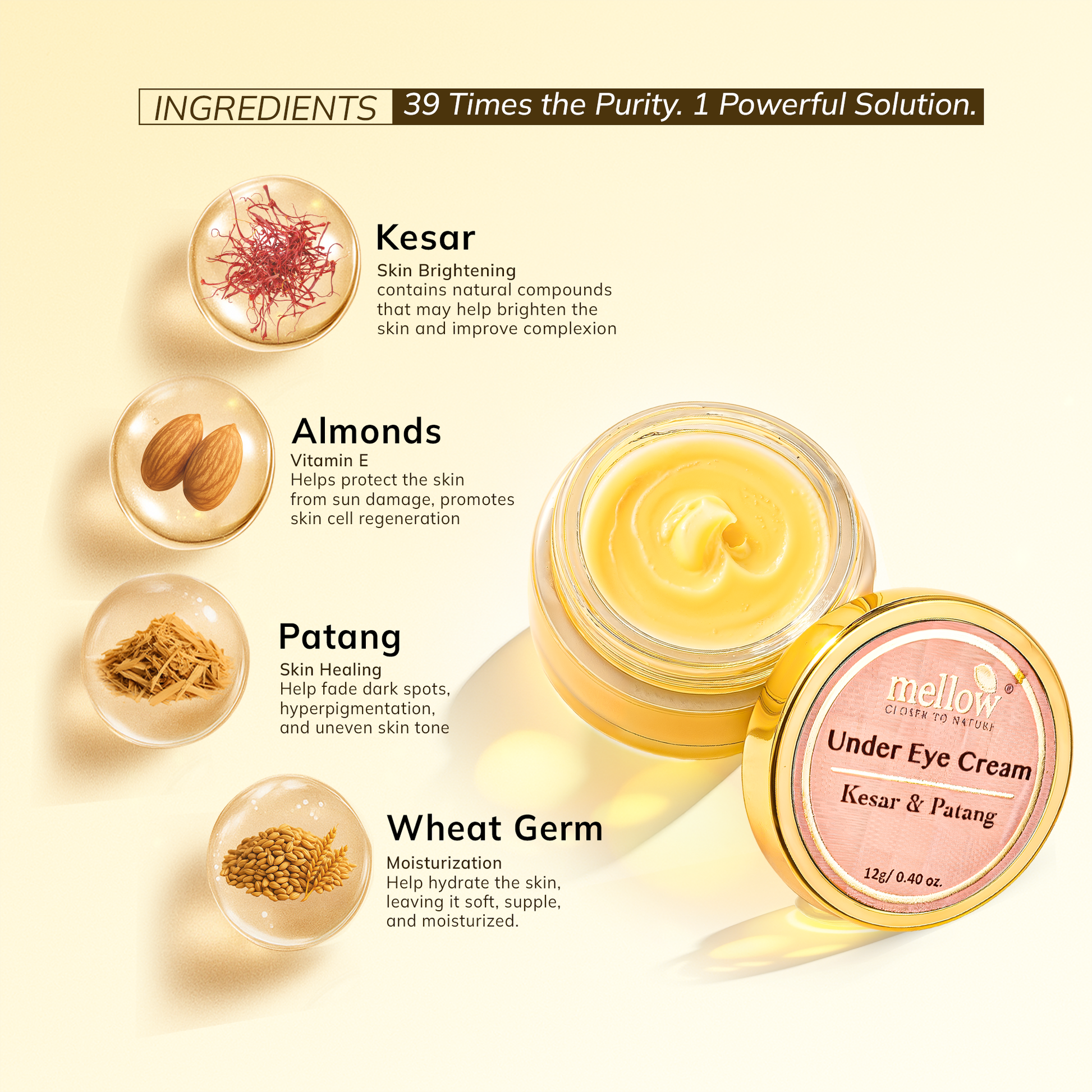 Experience the rejuvenating power of Kesar Under Eye Cream, made with saffron, marigold, wheat germ, and almonds. It reduces wrinkles, minimizes dark circles, and intensely nourishes for radiant skin.